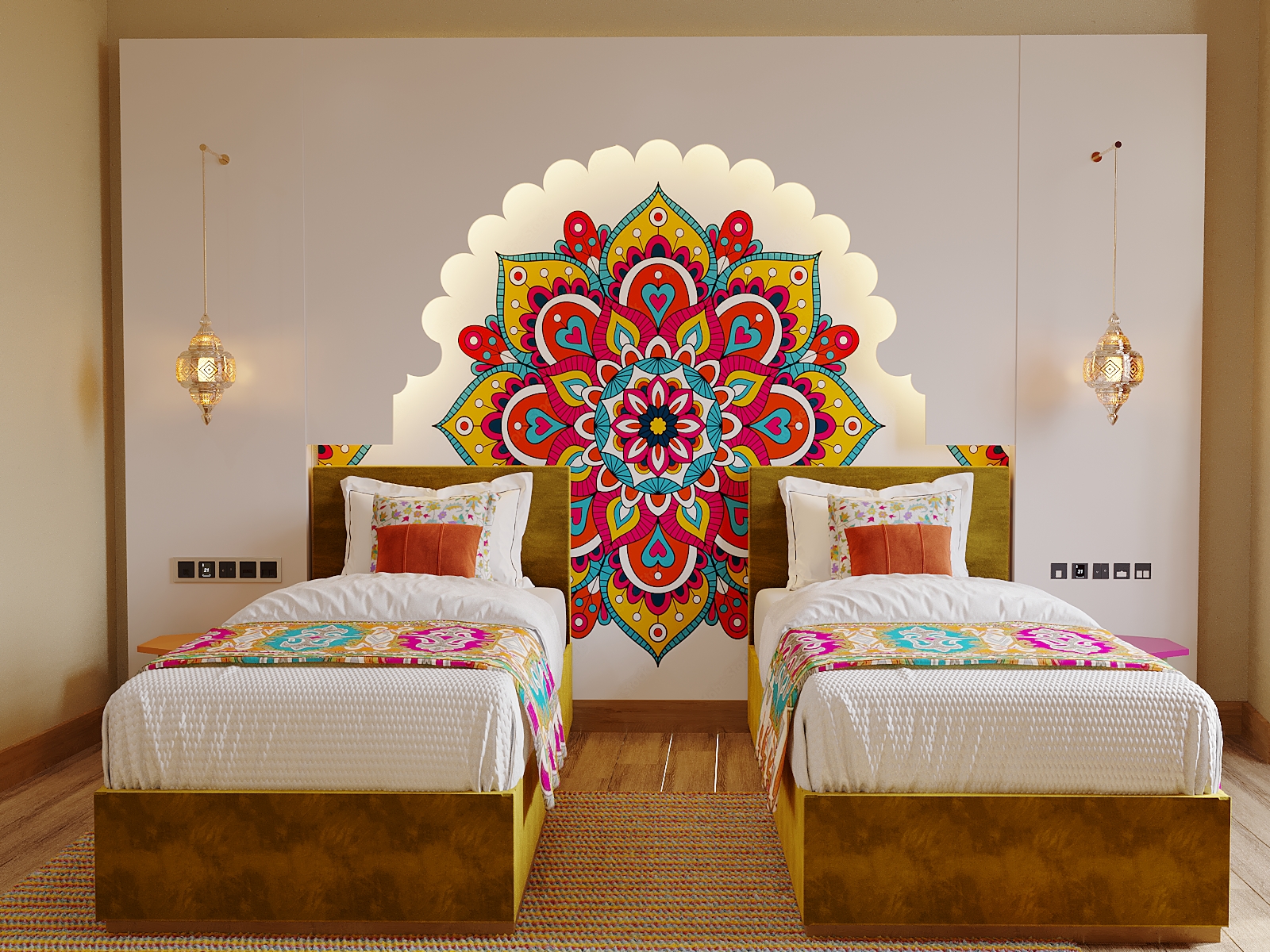 Room 402 offers an immersive Indian-themed experience, located on the front side of the building. It includes two single beds (convertible to a double), a smart TV, private bathroom, hair dryer, water kettle with tea and coffee, mini fridge, safe, and free Wi-Fi.